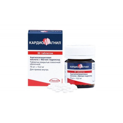 Для профилактики повторного инфаркта миокарда и тромбоза кровеносных сосудов назначают по 1 таблетки Кардиомагнила, содержащего ацетилсалициловую кислоту в дозе 75-150 мг 1 раз/