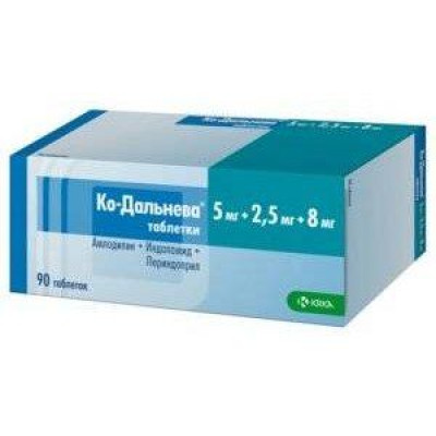 Ко-Дальнева® - комбинированный препарат, содержащий периндоприла эрбумин (ингибитор ангиотензинпревращающего фермента (А11Ф)), индапамид (тиазидоподобный диуретик) и амлодипин (блокатор quot;медленныхquot; кальциевых каналов (ВМКК)).