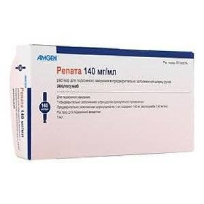 Перед началом терапии пациенты должны перейти к соответствующей гипохолестеринемической диете и соблюдать эту диету во время всего периода терапии препаратом Репата. Первичная гиперлипидемия и смешанная дислипидемия Взрослые: рекомендуемая доза препарата Репата составляет одна подкожная инъекция 140 мг каждые 2 недели или 420 мг ежемесячно. Обе дозы являются клинически эквивалентными. Один предварительно заполненный шприц (П3Ш) или одна предварительно заполненная шприц-ручка (ПЗШР) содержат одну дозу 140 мг для режима дозирования раз в две недели. Три ПЗШ или три ПЗШР должны вводится последовательно в течение 30 минут для доставки дозы 420 мг при режиме дозирования раз в месяц. Гомозиготная семейная гиперхолестеринемия Взрослые и дети старше 12 лет: рекомендуемая доза препарата Репата составляет 420 мг раз в две недели или раз в месяц подкожно. Пациенты, получающие аферез, могут начать лечение с 420 мг каждые две недели в соответствии с графиком афереза. Три ПЗШ или три ПЗШР должны вводится последовательно в течение 30 минут для доставки дозы 420 мг при режимах дозирования раз в две недели или раз в месяц. Особые группы пациентов Пациенты с нарушениями функции почек Не требуется коррекции режима дозирования (см. раздел «Фармакокинетика»). Пациенты с нарушениями функции печени Не требуется коррекции режима дозирования у пациентов с нарушениями функции печени слабой или умеренной степеней (классы А и В по классификации Чайлд-Пью т.е. не более 9 баллов по шкале Чайлд-Пью). Пациентов с тяжелыми нарушениями функции печени (класс С по классификации Чайлд-Пью) не включали в клинические исследования (см. раздел «ОСОБЫЕ УКАЗАНИЯ»), Пожилые пациенты Не отмечалось различий в эффективности и безопасности препарата у пожилых пациентов. Не требуется коррекции режима дозирования. Дети Эффективность и безопасность препарата Репата не изучалась у детей с первичной гиперлипидемией и смешанной дислипидемией. Четырнадцать подростков в возрасте 12 лет и старше были включены в исследования Го-СГХС. Не отмечено различий в эффективности и безопасности препарата у этих подростков и взрослых. Инструкция по использованию Следует оценить раствор перед введением на предмет наличия включений или изменения цвета. Раствор нельзя использовать при помутнении или изменении цвета, содержании мутных или окрашенных включений. Не встряхивать . Чтобы избежать дискомфорта в месте введения, следует согреть раствор до комнатной температуры (до 25°С) перед инъекцией, а затем медленно ввести все содержимое предварительно заполненного шприца или предварительно заполненной шприц-ручки. ПЗШ или П3ШР с остатками препарата выбросить. Подробные рекомендации по самостоятельному подкожному введению препарата включены в данную инструкцию по медицинскому применению. Любые количества неиспользованного препарата или неиспользованные материалы должны быть уничтожены в соответствии с местными требованиями.