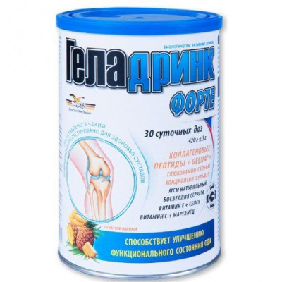 Геладринк ФОРТЕ является комплексным хондропротектором, который выполняет функцию восстановления нормального метаболизма хрящевой ткани, стимулирует процесс синтеза естественного коллагена, повышает антиоксидантную защиту и обеспечивает суставы и позвоночник дополнительными питательными веществами.