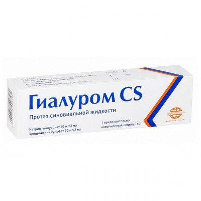 Гиалуром CS – протез синовиальной жидкости, стерильный, прозрачный вязкоэластичный раствор, в состав которого входят гиалуронат натрия 60 мг/3 мл и хондроитин сульфат натрия 90 мг/3 мл (зарегистрирован в РФ от 10.09.2008г. № РУ П N014581/01).