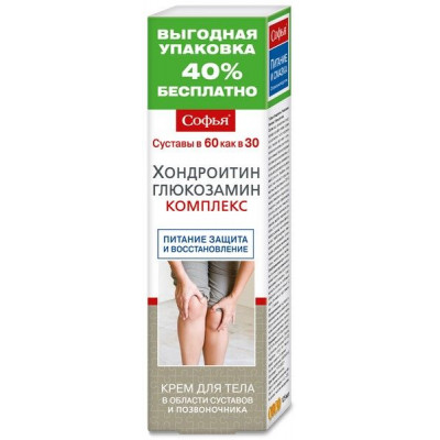 Преимущества крема СОФЬЯ. Комплекс с хондроитином и глюкозамином. Основу крема составляют натуральные ингредиенты – природные материалы для естественного обновления и восстановления суставных тканей. Крем улучшает функциональное состояние опорно-двигательного аппарата без побочных эффектов. Может применяться длительное время. В комплексной терапии остеохондроза и других заболеваний суставов сочетается с любыми лекарственными средствами.