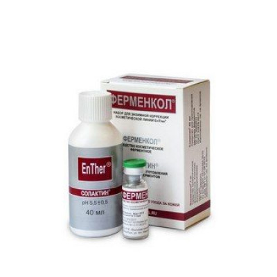 ФЕРМЕНКОЛ — уникальный ферментный комплекс из 9 коллагенолитических протеаз. Применяется для коррекции гипертофических и келоидных рубцов после операций, ран, ожогов, акне, а также в комплексной терапии контрактур. Ферменкол избирательно воздействует на избыточную рубцовую ткань и разрушает ее основные компоненты: коллаген, эластин и гиалуроновую кислоту. Готовый раствор ферментов применяют методом электрофореза. Процедуры электрофореза можно проводить в условиях физиотерапевтических и косметологических кабинетов или дома при помощи аппаратов Элфор и Элфор-проф. Электрофорез с Ферменколом — наиболее эффективный метод введения ферментов коллагеназы в рубцовую ткань. Постоянное электрическое напряжение позволяет вводить растворы ферментов, нанесенные на лечебные электроды, в глубоко расположенные участки рубцовой ткани. Солактин повышает эффективность транспорта ферментов в рубцовую ткань. Ферменкол применяют для коррекции рубцов в различных областях: - Хирургия: Избыточные послеоперационные рубцы или риск их образования. - Травматология и ортопедия: Контрактуры суставов, контрактура Дюпюитрена. - Гинекология: Рубцы после гинекологических операций, в том числе перинеотомии. - Урология: Процессы рубцевания в области мочевого пузыря, мочеточников, уретры и наружных половых органов. - Оториноларингология: Тугоухость вследствие рубцовых изменений. - Комбустиология: Послеожоговые рубцовые деформации. - Дерматология и косметология: Гипертрофические и келоидные рубцы, осложнения после введения филлеров, постакне.