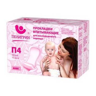 Серия П4 предназначена для активных выделений в первые три дня после родов, поскольку обладают большой впитываемостью. Для фиксации прокладки рекомендуется использовать эластичные сетчатые трусики «Пелигрин».