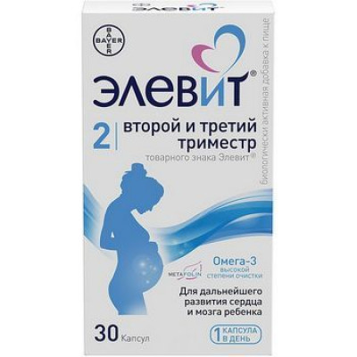 Элевит® 2 - Второй и Третий Триместр т.з. Элевит® БАД к пище. Рекомендовас со 2-го триместра беременности и до рождения ребенка. Содержит 12 витаминов и 6 микроэлементов, а также омега-3 высокой степени очистки в 1 капсуле. Способствует дальнейшему развитию сердца и мозга ребенка.
