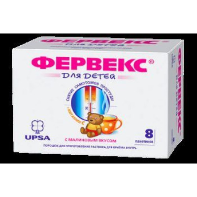 Фервекс® для детей – комбинированный препарат, который содержит парацетамол, фенирамина малеат и аскорбиновую кислоту. Парацетамол – нестероидный противовоспалительный препарат, блокирует циклооксигеназу, преимущественно в центральной нервной системе, воздействуя на центры боли и терморегуляции; оказывает анальгезирующее и жаропонижающее действие. Парацетамол обладает анальгезирующим и жаропонижающим действием. Фенирамина малеат – блокатор Н1-гистаминовых рецепторов. Суживает сосуды носа, устраняет отечность и гиперемию слизистой оболочки полости носа, носоглотки и придаточных пазух носа. Аскорбиновая кислота принимает участие в регуляции окислительно-восстановительных процессов, уменьшает проницаемость сосудов и повышает сопротивляемость организма.