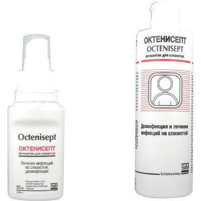 Обработку производят поочередно двумя тампонами, обильно смоченными Октенисептом. Пораженная поверхность должна быть обработана полностью. На легкодоступные участки препарат можно наносить путем распыления. Время экспозиции — не менее 1–2 мин.