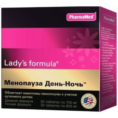 Если женщина с трудом контролирует эмоции, быстро утомляется, рассеяна, плохо засыпает, часто просыпается от горячих приливов и сильной потливости, ей подойдет натуральный биокомплекс Lady''s formula «Менопауза День-Ночь», который обеспечивает эмоциональный и физический комфорт на протяжении 24 часов. Это единственный на российском рынке 100% растительный комплекс с дневной и ночной формулами для устранения симптомов менопаузы с учетом суточного ритма. Дневная формула – устраняет приливы жара, потливость, улучшает настроение, повышает активность и работоспособность. Ночная формула – устраняет ночные приливы и потливость, восстанавливает нормальный сон (засыпание, отсутствие ночных пробуждений) и обеспечивает полноценный отдых ночью. Биокомплекс Ladys formula® Менопауза День-Ночь™ не имеет побочных эффектов гормональной терапии, не вызывает привыкания, рекомендован Российским обществом акушеров-гинекологов.
