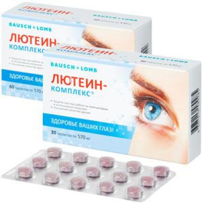 «ЛЮТЕИН-КОМПЛЕКС» – безопасное и эффективное средство для защиты глаз при работе за компьютером и интенсивных нагрузках. Является источником каротиноидов, флавоноидов, витаминов и минеральных веществ, необходимых для поддержания функционального состояния и оптимизации работы зрительного аппарата при повышенных зрительных нагрузках. Таблетки цилиндрические двояковыпуклые неоднородного от светло- до темно-фиолетового цвета со множеством вкраплений, покрытые прозрачной пленочной оболочкой. Со слабым, характерным для используемого сырья запахом. Примечание: цвет таблеток зависит от количества биологически неактивных пигментов в различных партиях растительного сырья (черника), использованного для производства продукта. Такие изменения не связаны с отклонениями в составе или биологической активностью продукта. Данные колебания не могут быть основанием для сомнений в подлинности продукта и соответствуют ТУ.