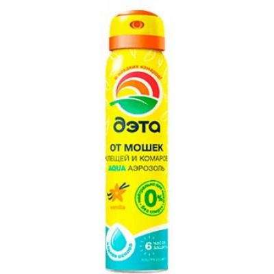Аква аэрозоль от мошек, клещей и комаров Дэта 100 мл - это уникальный продукт тройного действия: отпугивает мошек, клещей и комаров. Изготовлен на водной основе, по профессиональной рецептуре. Аква аэрозоль не сушит кожу. Продолжительность действия аэрозоля до 6 часов. Он обязательно поможет Вам в борьбе с надоедливыми насекомыми.